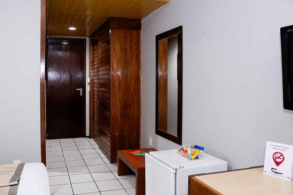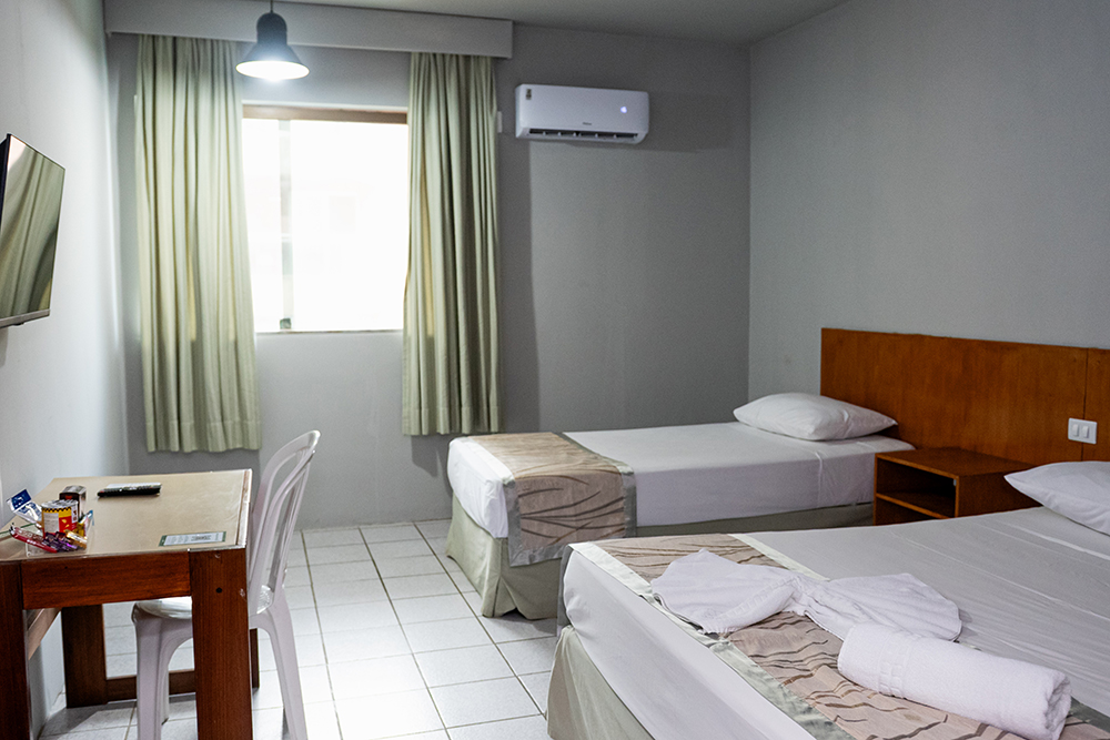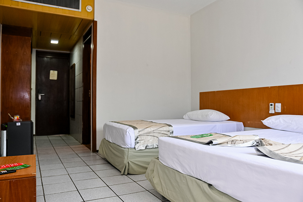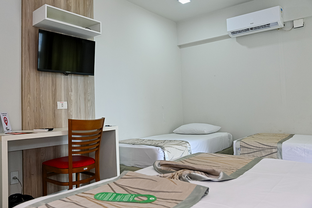 O espaço admite montagem de 1 cama de casal, 1 cama de casal + 1 solteiro ou 1 cama de casal + 2 solteiros, mantendo TV a cabo, frigobar completo, telefone no quarto,ar-condicionado e outros itens de conforto.