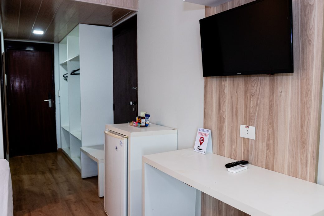 Conta com TV a cabo, frigobar completo, telefone no quarto, som ambiente e ar-condicionado.